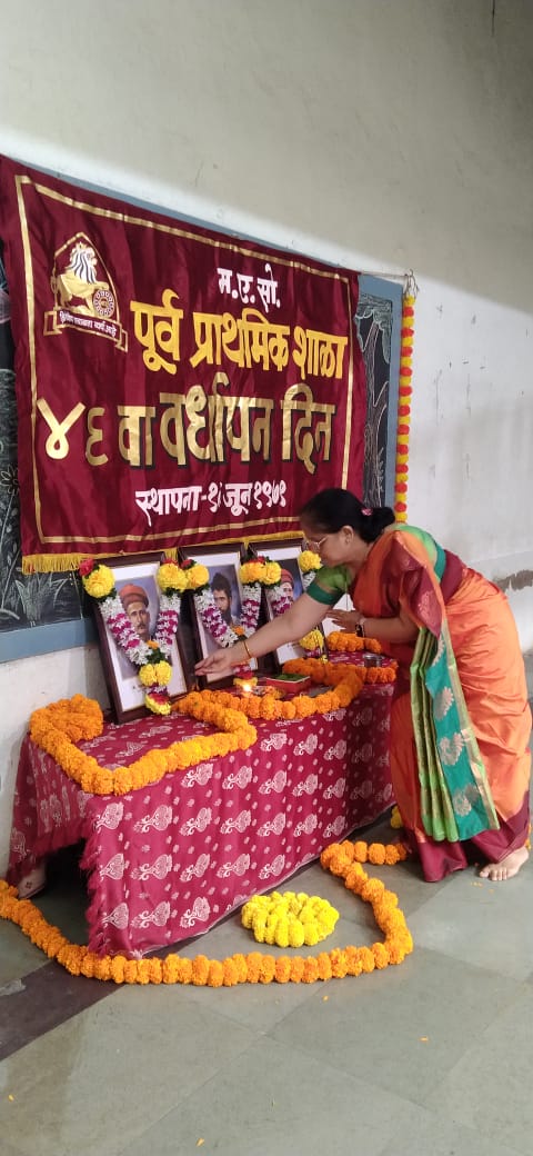 त्यानिमित्ताने मुख्याध्यापिका सौ मेधाताईंनी आपल्या महाराष्ट एज्युकेशन सोसायटीच्या संस्थापकांच्या प्रतिमांचे पूजन केले.