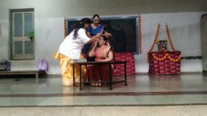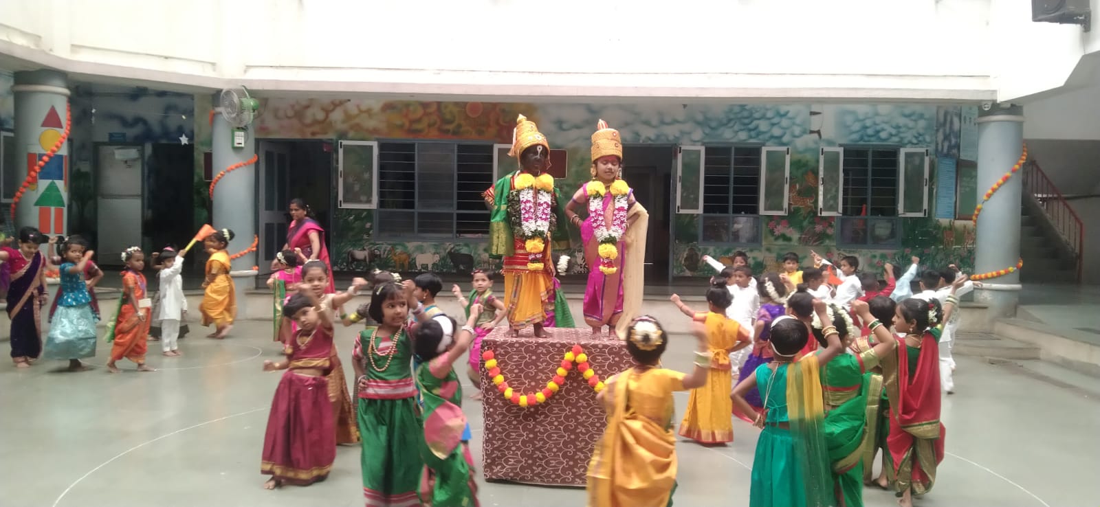 नवरात्रीमध्ये देवीच्या प्रत्येक रूपाचे एक वेगळे महत्त्व आहे. ते समजण्यासाठी नवदुर्गांच्या वेशात आलेल्या माता पालकांनी नऊ दुर्गांची ओळख करून दिली. त्यानंतर मोठ्या गटातील मुलींनी सादर केलेल्या देवीच्या गोंधळ नृत्याने सगळ्यांचे लक्ष वेधून घेतले.