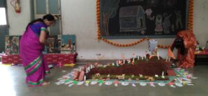 बुधवारी सगळी शाळा आकाशकंदील, दिवे, रांगोळी, किल्ला त्यावरील चित्र, माळांनी सजली होती. मोठ्या गटाच्या मुलांनी दिवाळीच्या प्रत्येक दिवसाचे महत्व मुलांना सांगितले. दिवाळीत आपण काय काय करतो, फटाके उडवताना काय काळजी घ्यायची, दिवाळी सुट्टीत काय करायचं, अशा विविध गोष्टी मुलांना शिक्षकांनी समजावून सांगितल्या. दिवाळीची बडबडगाणी म्हणत मुलांनी लाडू चिवडा फराळाचा आनंद घेतला. सगळी मुलं खूप आनंदी होती.